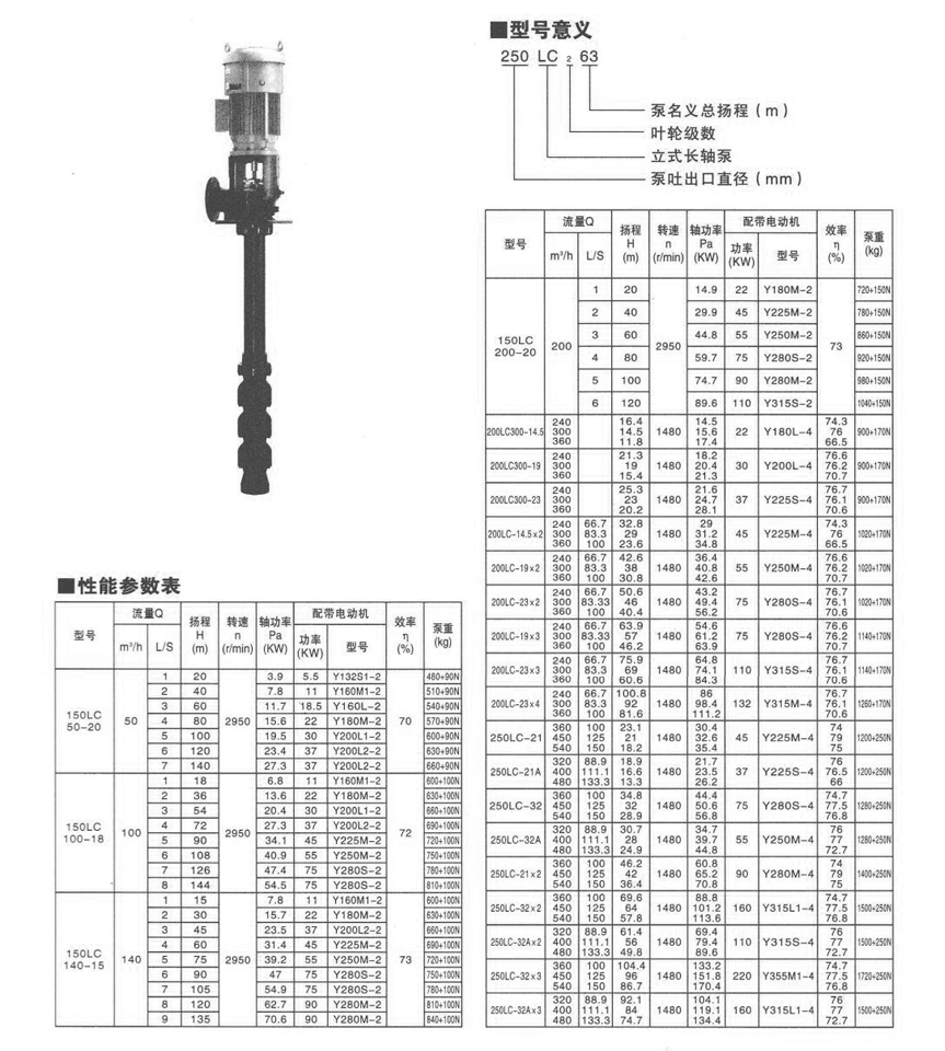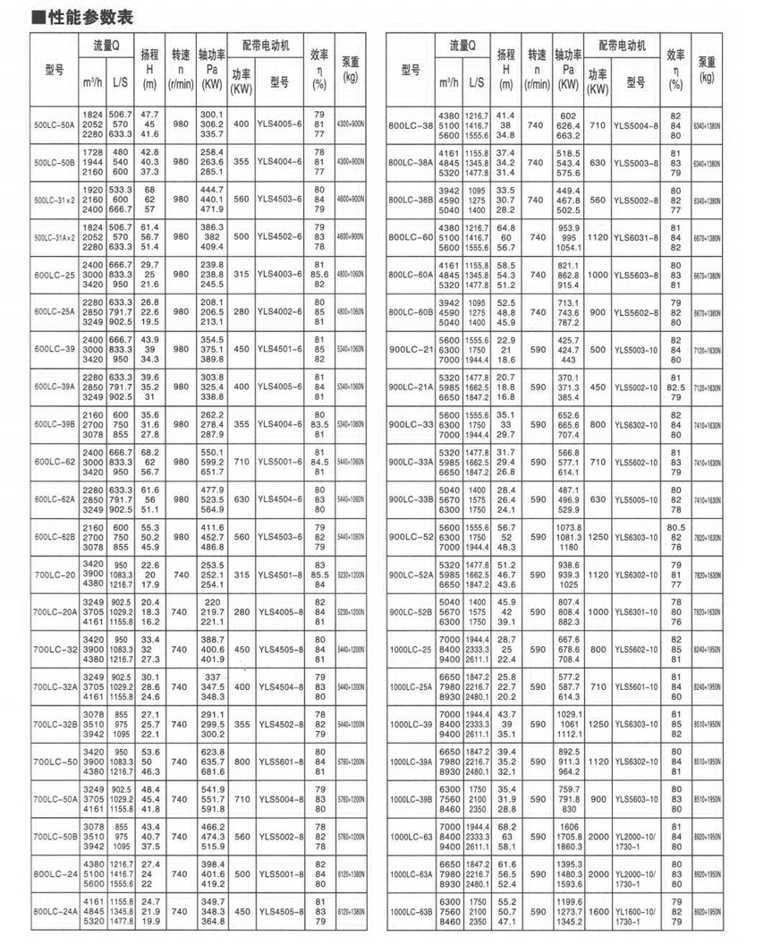 | LC型(xing)系列立(li)式長軸(zhóu)泵,采用(yòng)浸沒式(shi)葉輪.立(lì)式安裝(zhuang),具有結(jie)構緊湊(còu),工作平(píng)穩,操作(zuò)簡便,通(tōng)用化程(cheng)度高等(děng)優點。 主(zhǔ)要用途(tu) •用于輸(shū)送清水(shui)、污水、具(jù)有腐蝕(shí)性工業(yè)廢水或(huò)相似的(de)液體。 •工(gōng)農業給(gei)水及城(cheng)市工廠(chang)污水的(de)排放。性(xing)能範圍(wéi) •轉速:590r/min一(yī)2950r/min •出口直(zhí)徑:100-1000mm •流量(liang):30-9400m'/h •揚程:9.7-80.4m •功(gōng)⭕率:4-2000kw |